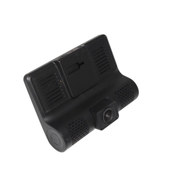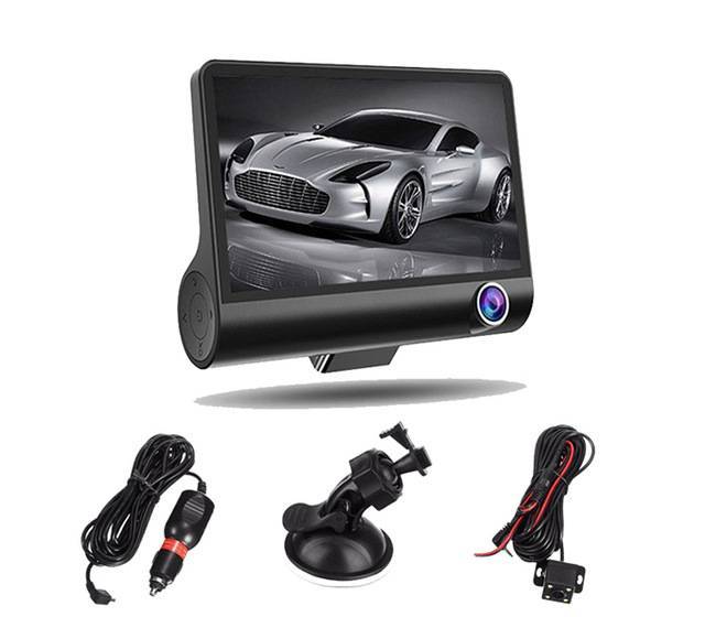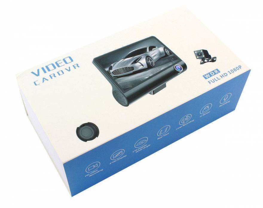 Сам регистратор обладает большим 4 дюймовым экраном, в комплекте идет присоска для крепления на лобовое стекло. Дисплей отображает время и дату, режим съемки, длину записываемого файла, индикатор заряда батареи, микрофон (запись со звуком или без).