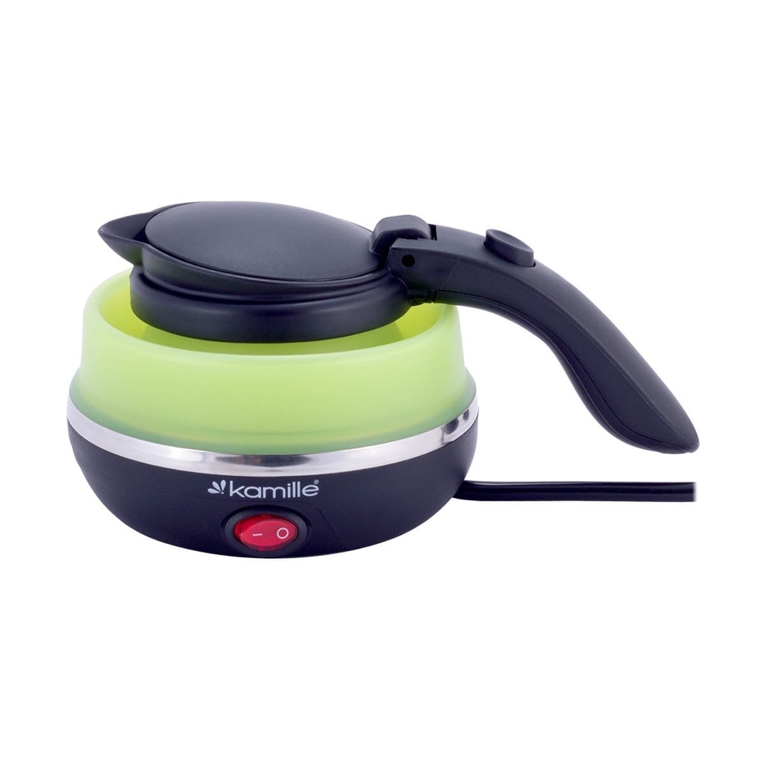 Чайник электрический складной. Материал: силикон, пластик. Общий объем: 0,5л. Напряжение: 220-240V. Питание: 50/60Hz 750W. Сетевой штекер и кабель питания встроенные. Длина шнура: 70см. Цвет: зеленый с черным. Есть показатель уровня воды min/max. Высота: в разложенном виде 15,2см, в сложенном виде 10,3см. Тип ручки: фиксированная. Автоматическая кнопка выключения. Скрытый нагревательный элемент из нержавеющей стали. Упаковка: цветная картонная коробка 18,5*13,5*10,5см.