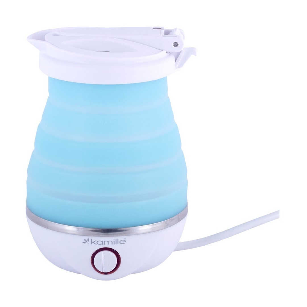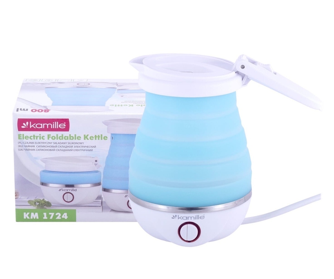 Чайник электрический складной. Материал: силикон, пластик. Общий объем: 0,8л. Напряжение: 220-240V. Питание: 50/60Hz 750W. Сетевой штекер и кабель питания встроенные. Длина шнура: 70см. Цвет: голубой с белым. Есть показатель уровня воды min/max. Высота: в разложенном виде 18,4см, в сложенном виде 10,3см. Тип ручки: складная. Автоматическая кнопка выключения. Скрытый нагревательный элемент из нержавеющей стали. Упаковка: цветная картонная коробка 18,5*13,5*11см.