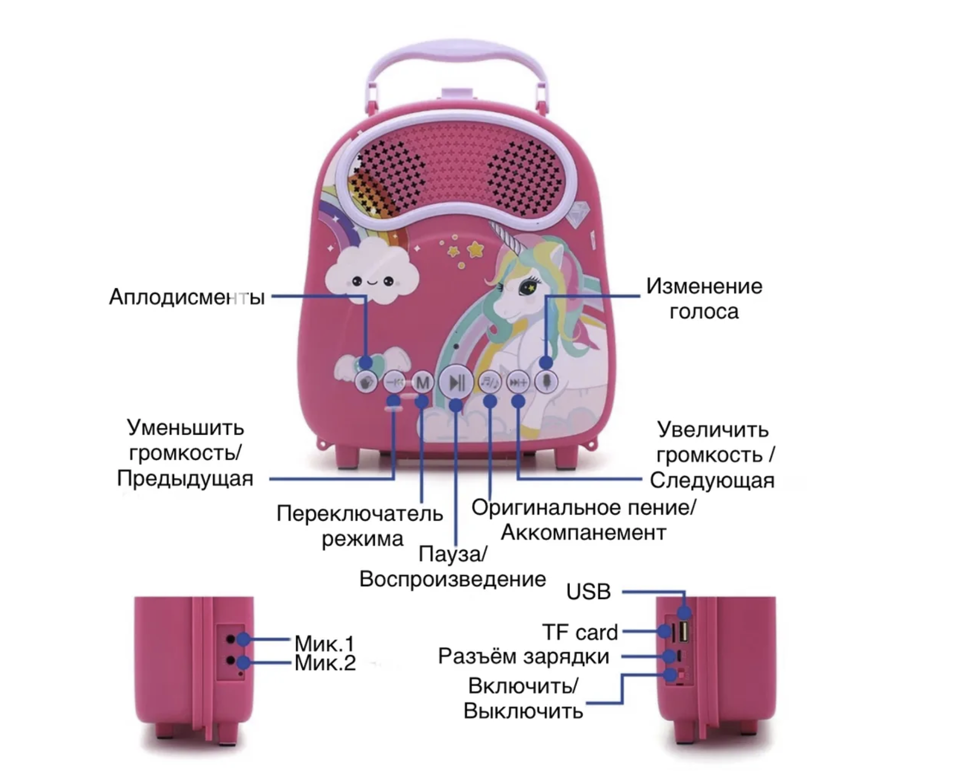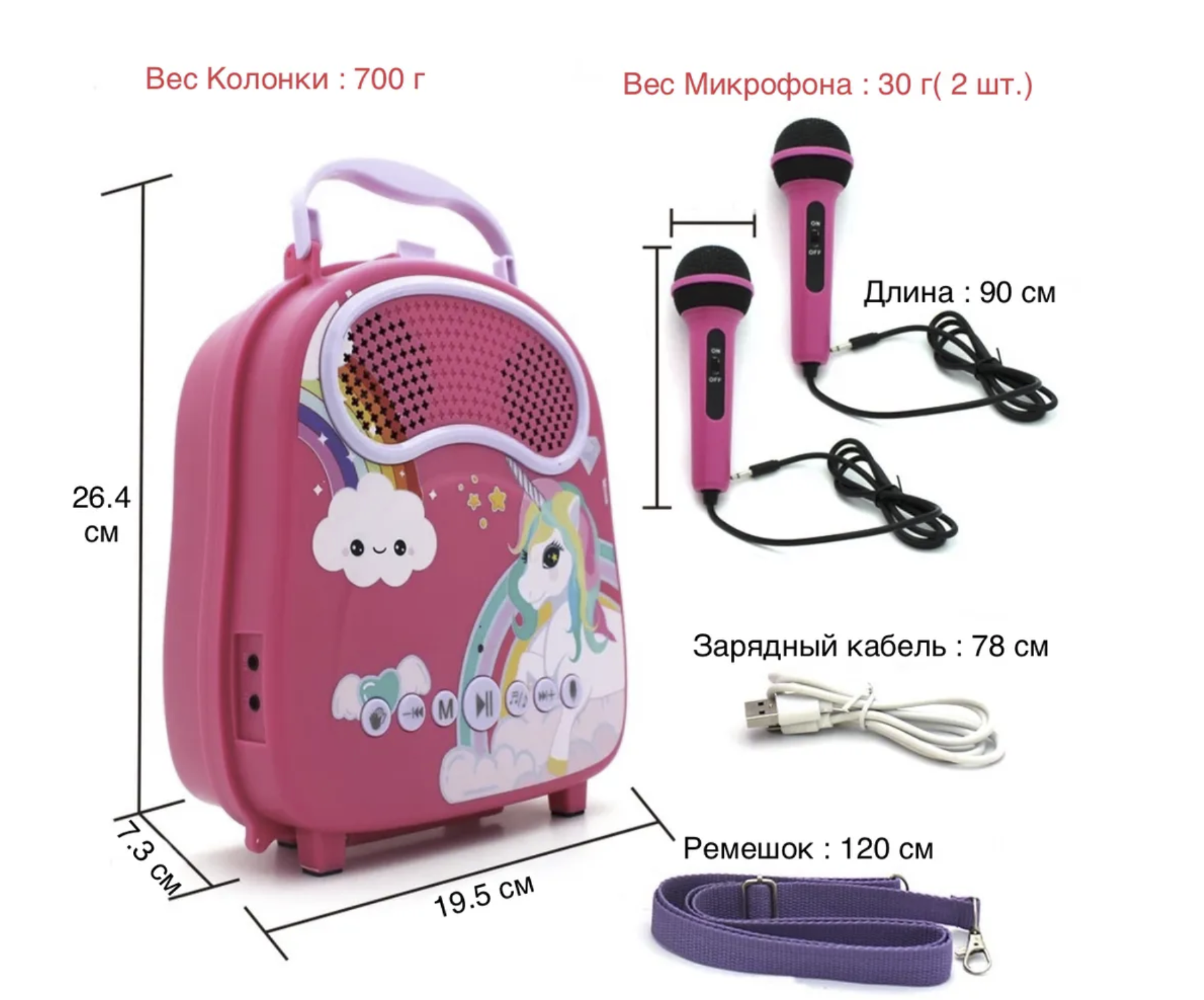 Детская караоке колонка оснащена функцией Bluetooth, громким динамиком и двумя проводными микрофонами.