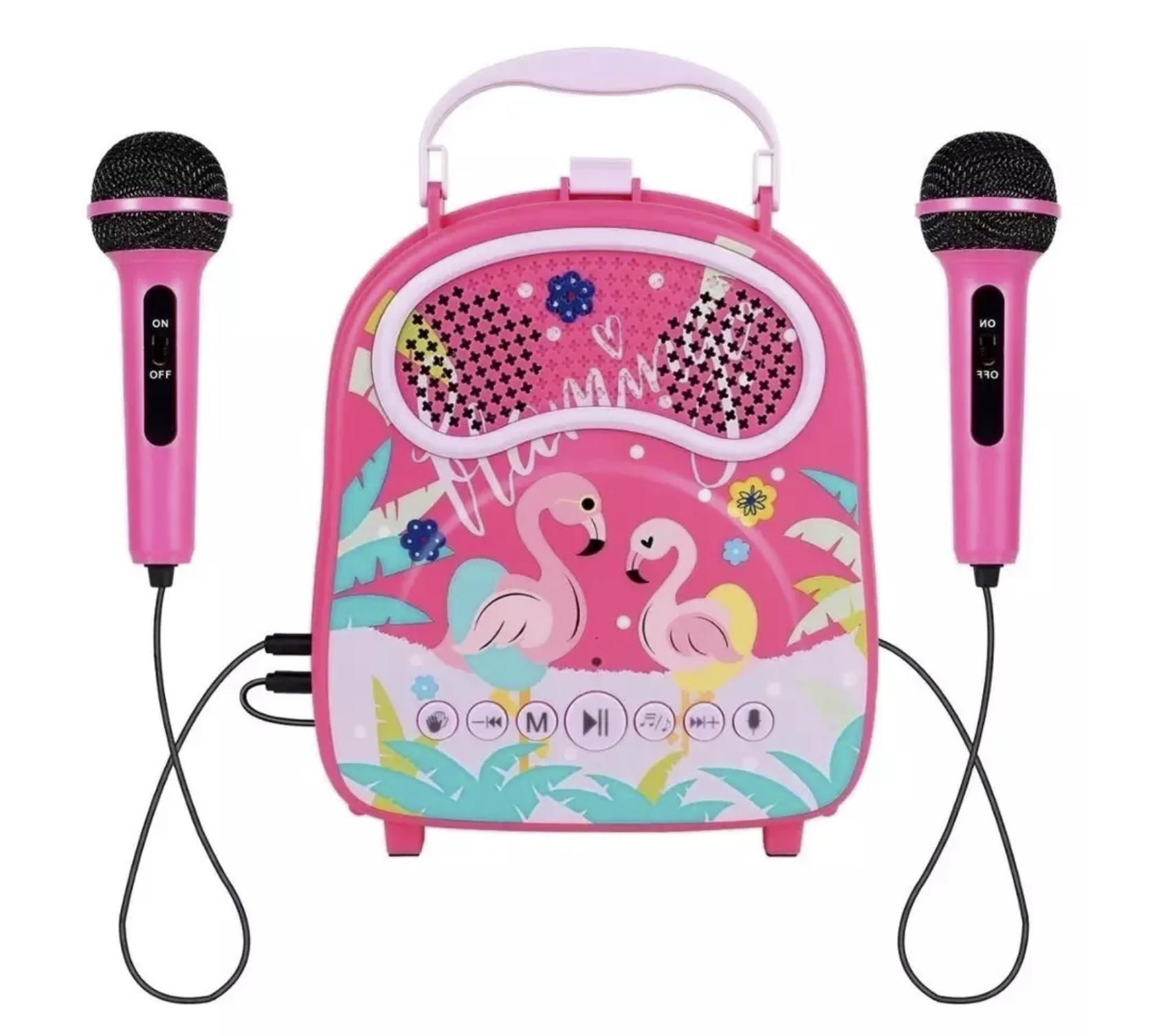 Детская караоке колонка оснащена функцией Bluetooth, громким динамиком и двумя проводными микрофонами.