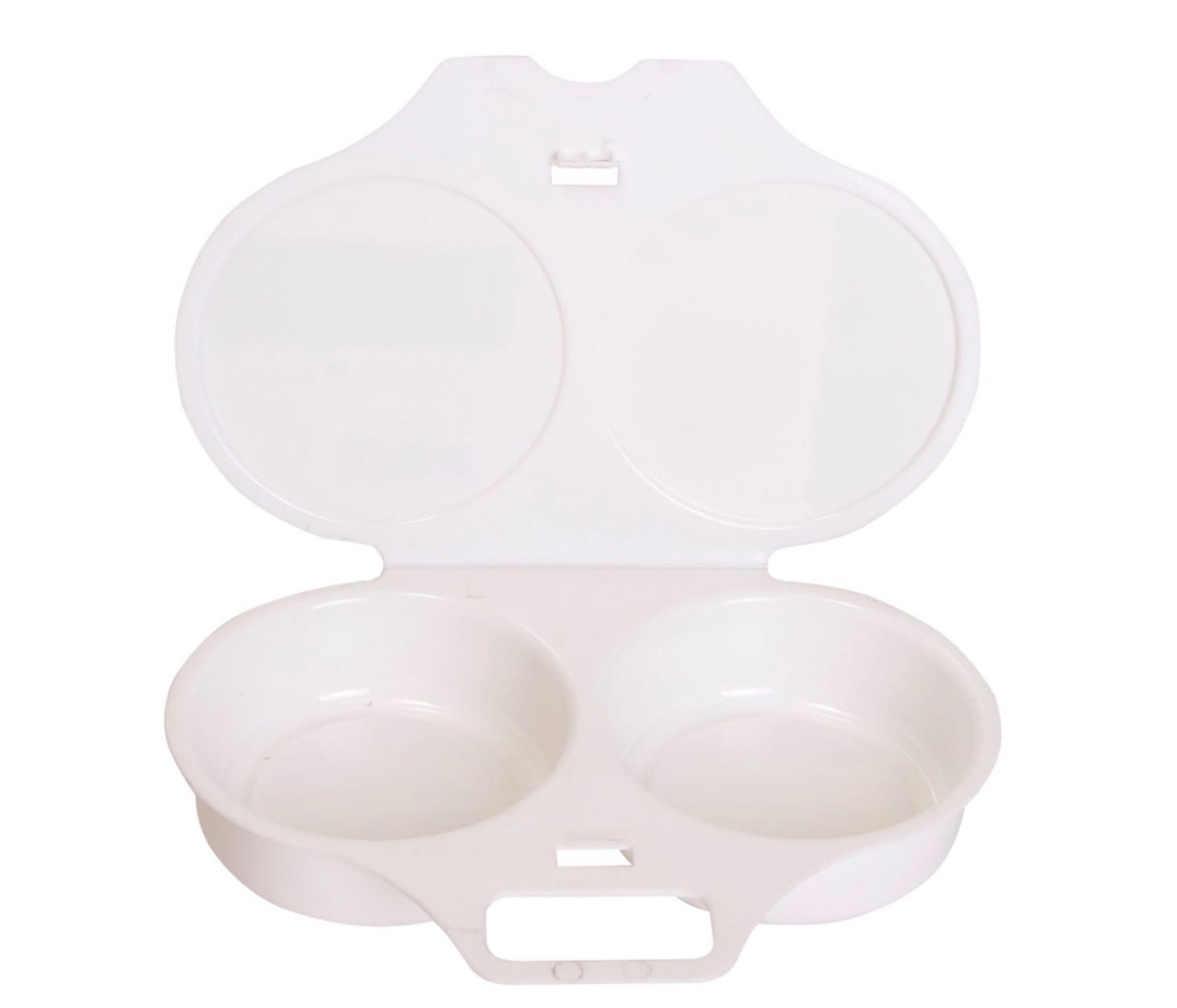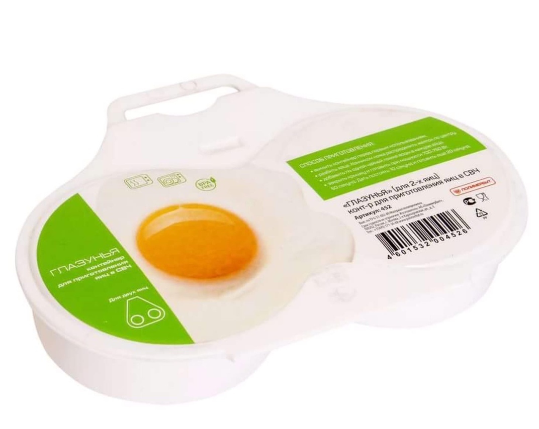 Форма изготовлена из пластмассы. В ней можно приготовить яичницу-глазунью из двух яиц в микроволновой печи.Размер: 160х120х30 мм.