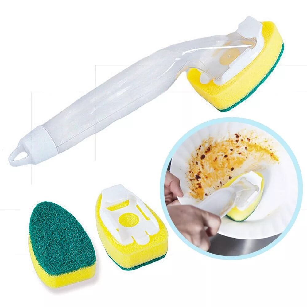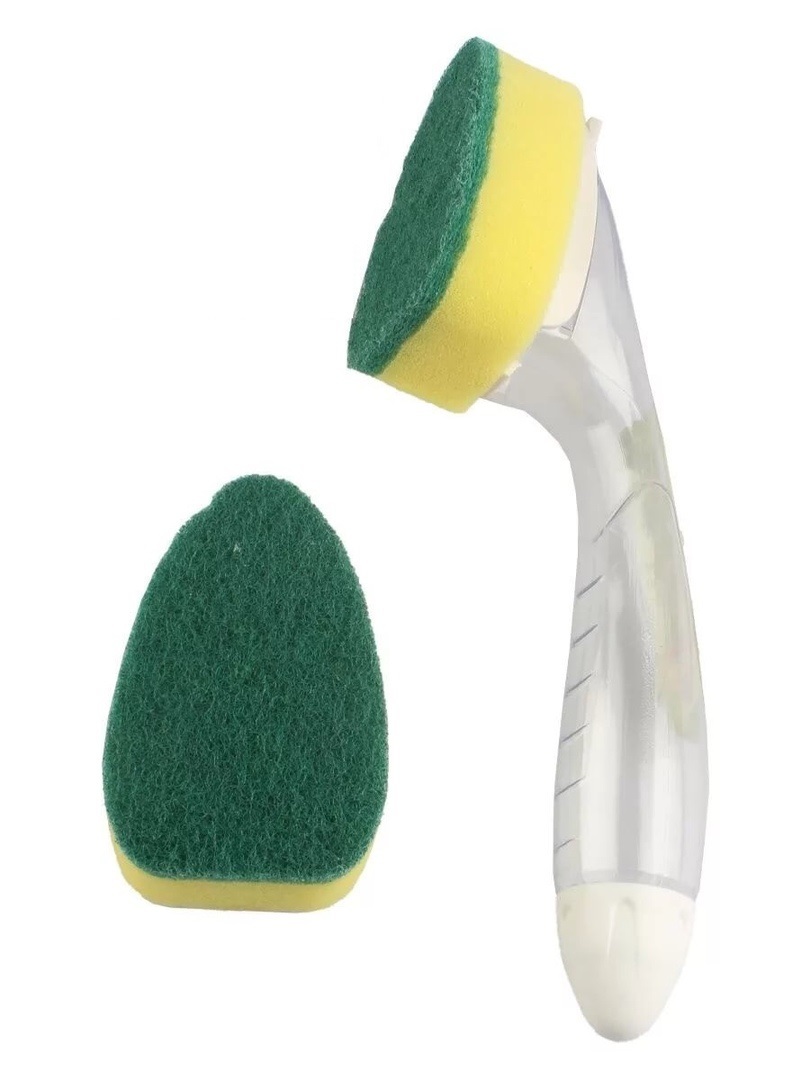 Главное преимущество этой губки, насадка, к которой подсоединяется специальная полая внутри ручка. В эту ручку наливается любое средство для мытья посуды, которое во время этого процесса дозировано и равномерно распределяется.
