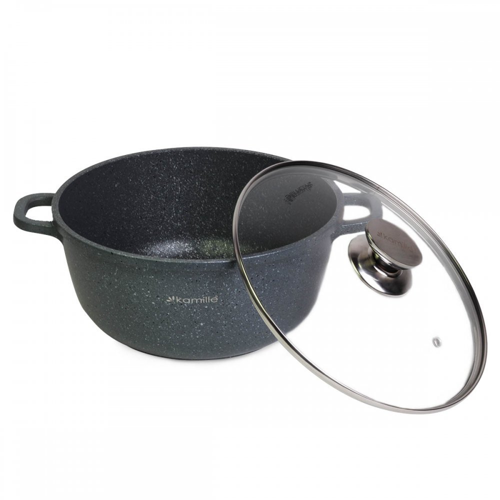 Материал: литой алюминий. Крышка: жаропрочное стекло. Объем: 4.5л. Внутренний диаметр: 24см., высота 11,5 см. Антипригарное покрытие: гранит. Тип дна: многослойное. Мерная шкала: нет. Тип ручек: литые (цельнолитые). Крышка с отверстием для выхода пара: да. Цвет: серый. Тип плиты: электрическая, стеклокерамическая, индукционная, газовая. Подходит для мытья в посудомоечной машине: да. Упаковка: цветная картонная коробка