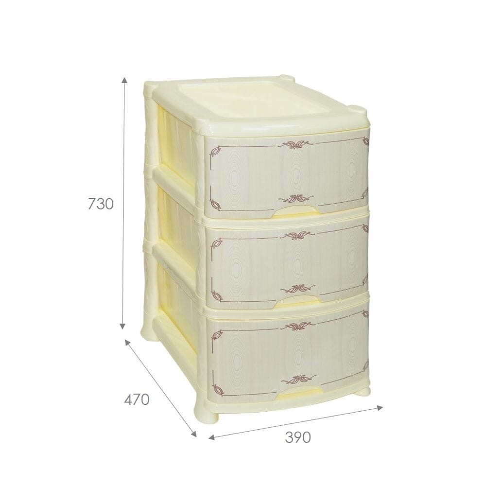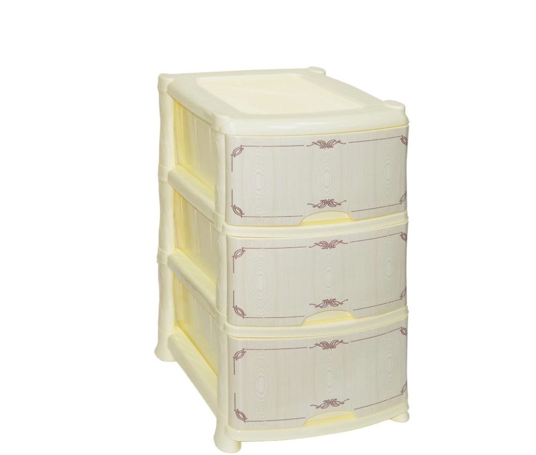 Комод из пищевого пластика с тремя выдвижными ящиками предназначен для хранения вещей и продуктов питания и гармонично впишется в интерьер любой комнаты. Легкий и вместительный комод поможет обеспечить порядок, избавит от разбросанных игрушек или одежды, убережет продукты от пыли и заветривания. Передние панели комода декорированы по технологии IML (вплавляемая этикетка) для создания индивидуального стиля. Не рекомендуется размещение пластикового комода вблизи батарей центрального отопления и электрических обогревателей.