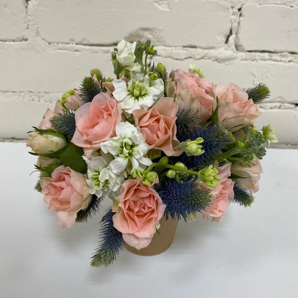 Роза кустовая,матиола, ирингиум, уазис флористический, стакан крафтовый