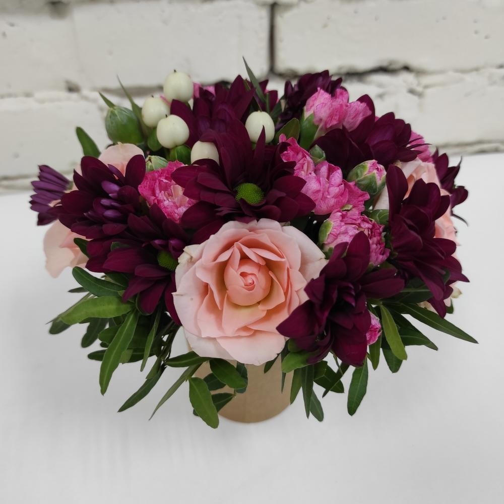 Роза кустовая, хризантема кустовая, гиперикум, диантус кустафой, писташь, уазис флористический, стакан крафтовый