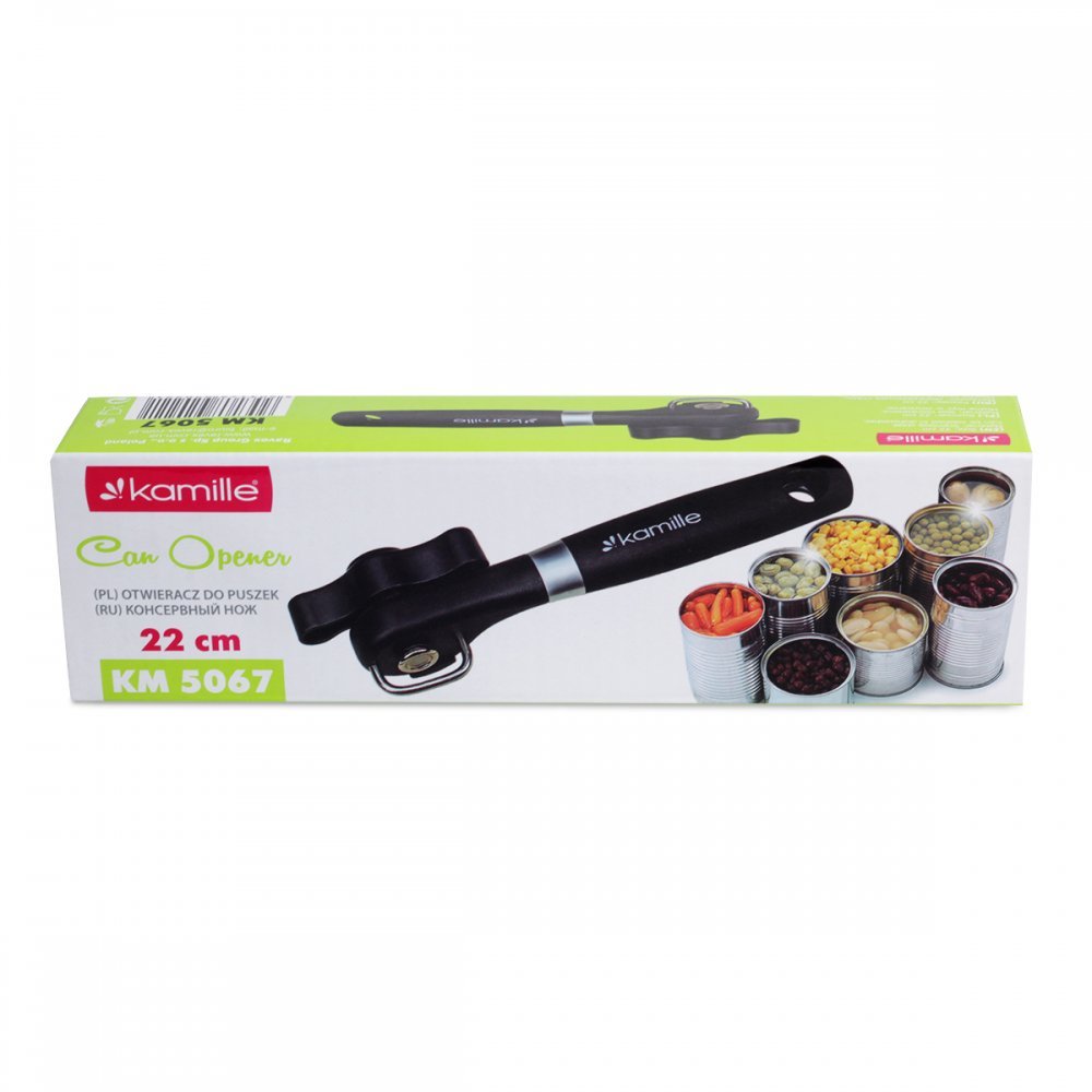 Материал: нержавеющая сталь, пластик. Длина: 22см. Тип ножа: механический. Петля для подвешивания: есть. Назначение: для открывания консервных банок. Подходит для мытья в посудомоечной машине: нет. Упаковка: цветная картонная коробка 22.5*4*6.5см.