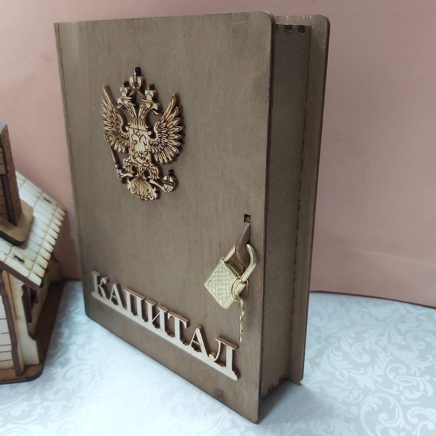 КОПИЛКА КНИГА С ГЕРБОМ РОССИИк а п ит а лМатериал деревоСделано в РоссииРазмеры 180×160×40 мм