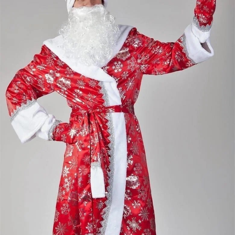 Дед Мороз облачён в красивую ярко-красную шубу, которая расписана блестящими серебристыми снежинками. Шуба подпоясывается широким красно-серебристым поясом, который украшен на концах мехом.