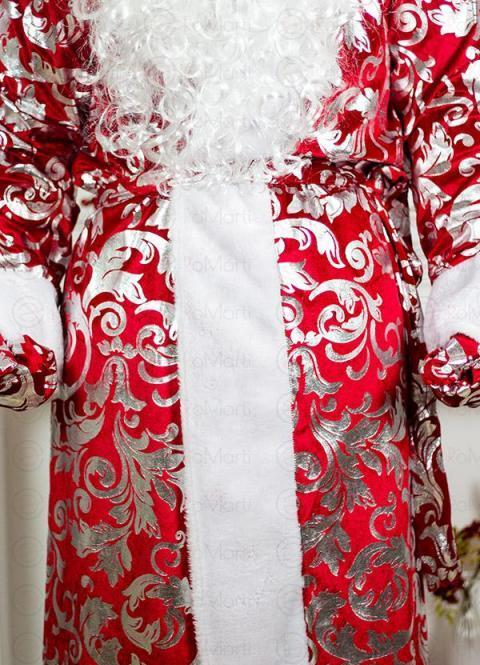 Дед Мороз облачён в красивую ярко-красную шубу, которая расписана блестящими серебристыми узорами. Шуба подпоясывается широким красно-серебристым поясом, который украшен на концах мехом.