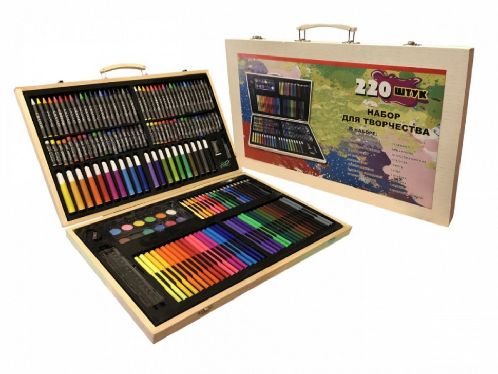 Набор для рисования в деревянном чемоданчике (220 предметов) подарит Вашему ребенку море положительных эмоций. Любовь к различным аксессуарам для рисования, раскрашивания и отражения собственных фантазий на бумаге, проявляется у всех детей, начиная с самого юного возраста. Чемоданчик в виде деревянного кейса продуман до мелочей. Большое разнообразие цветов представлено во всех любимых предметах – фломастерах, карандашах, мелках и красках. Дополнительно к набору прилагаются ластики, кисти и формочки. Чемоданчик для рисования удобно хранить и брать с собой.