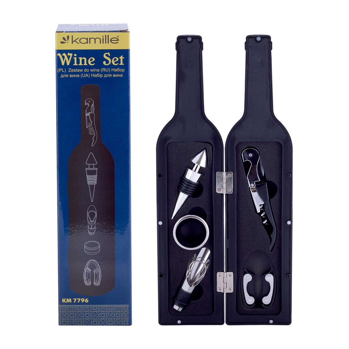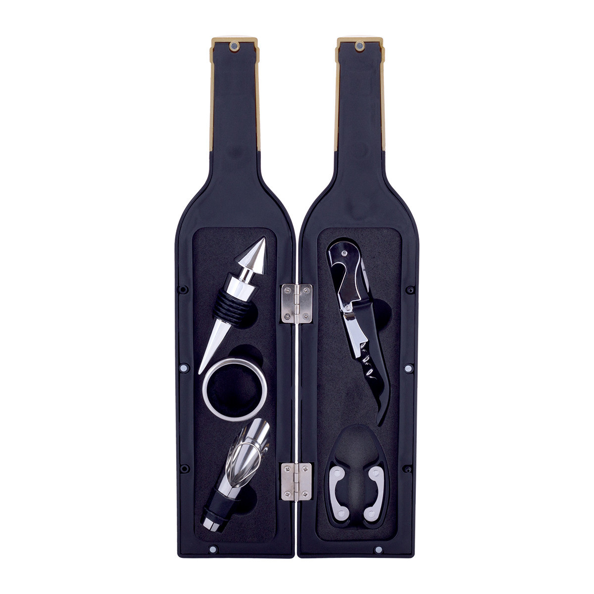 В комплект входят: нож для фольги, штопор с ножом для открывания вина, кольцо для предотвращения попадания вина на скатерть, дозатор с пробкой для облегчения розлива, пробка.