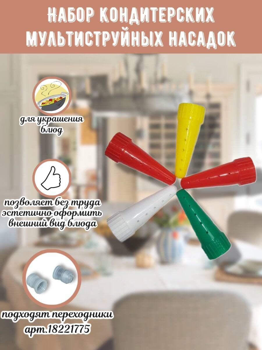 Мультиструйный наконечник на дозатор эластичной тары с майонезом. Позволяет распределять майонез непосредственно с заводской упаковки на рабочую поверхность (салата, запеканки) в несколько тонких ровных струй, что существенно ускоряет и упрощает процес приготовления блюд, позволяет без труда эстетично оформить внешний вид блюда.