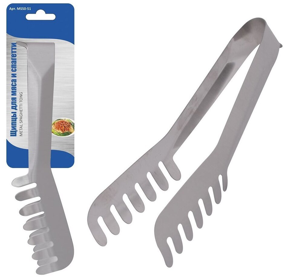 Кулинарные щипцы для мяса и спагетти станут полезным дополнением к традиционному набору аксессуаров для кухни. Инструмент многофункционален и практичен в использовании. Щипцы предназначены для переворачивания мяса и рыбы во время жарки и тушения, раскладывания по тарелкам спагетти, перемешивания салатов. Зубчики обеспечивают крепкий захват продуктов и предотвращают выскальзывание, что очень важно при раскладывании по порциям. Щипцы изготовлены из коррозионностойкой (нержавеющей) стали.