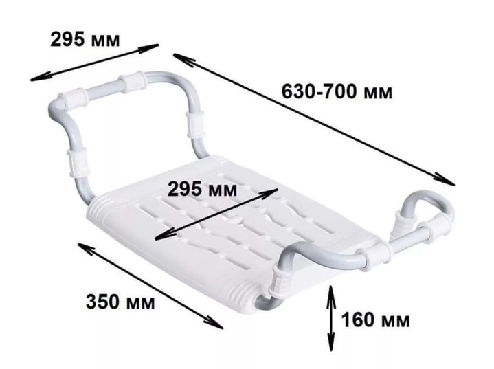 «Раздвижное» сиденье, закрепленное к каркасу, регулируется по ширине ванны. Конструкция позволяет менять размер между опорами от 630 до 700 мм. Цвета в ассортименте. Размер сиденья – 340х280 мм. Каркас: металл + пластмасса Вес изделия - 1,4 кг.