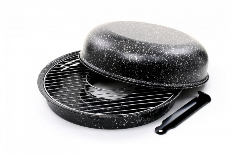 Приготовление происходит за счет конвекции горячего воздуха под крышкой гриля. Гриль необходимо установить на конфорку,диаметр конфорки должен быть меньше диаметра отверстия в нижней части сковороды. Зажгите огонь, сделав минимально средний уровень пламени, на решетку гриля выложите ваш продукт, накройте крышкой и все. Продукт готовиться без добавления масла, продукт не нужно переворачивать. Отсутствует прямой контакт продукта с нагреваемой поверхностью что облегчает уход за сковородой. Мраморное покрытие - двухслойное антипригарное покрытие с эффектом мрамора, покрытие безопасно для здоровья, очень прочное, долго удерживает тепло, обладает отличными антипригарными свойствами.