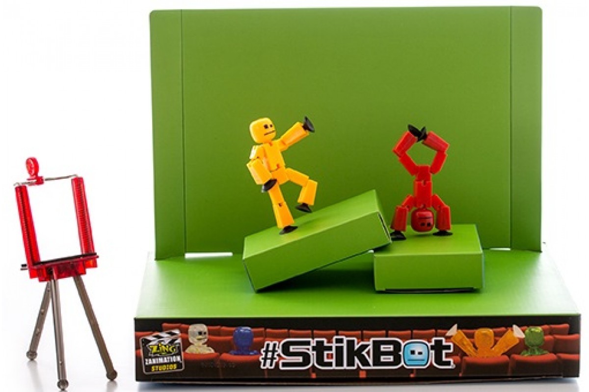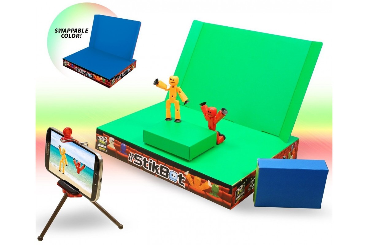 Набор «Анимационная студия Stikbot со сценой» представлен фигурками Стикботов, штативом для мобильного устройства и специальным экраном со сменными панелями синего и зеленого цветов. С помощью экрана можно будет создавать фон для ролика, используя для этого собственные фотографии из памяти смартфона. Для начала трудоёмкого, но очень увлекательного процесса необходимо скачать бесплатное мобильное приложение, которое поможет правильно расположить актёров в кадре, создаст фон и спецэффекты.