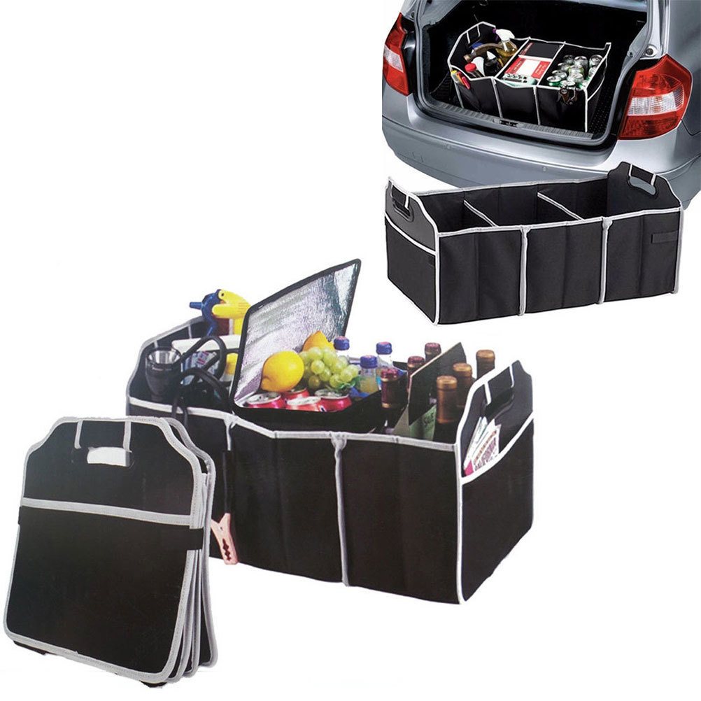 Автомобильный органайзер можно трансформировать, он уменьшается вдвое или полностью складывается. Если вы сложите органайзер, то можете положить его под сиденье или в угол багажника. Всего в органайзере три больших отделения и два боковых кармана с внешних сторон. Также есть удобные ручки для переноски органайзера. Ткань из которой сделан автомобильный органайзер достаточно крепкая с прочной конструкцией. Так в вашем багажнике будет всегда порядок и чистота. Три основных пространственных отделения позволяют разделить предметы в зависимости от своего предназначения.