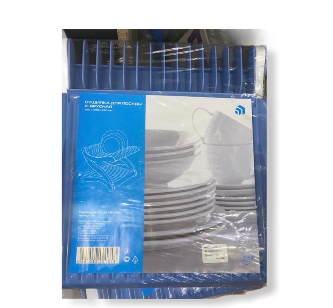 В отделе посуды также отличная новинка - сушилка для посуды двух-ярусная, изготовлена компанией Полимербыт г. Москва. Продаётся она в сложенном виде. Пластик очень плотный, сделан качественно.Размер 29*25*24 см.
