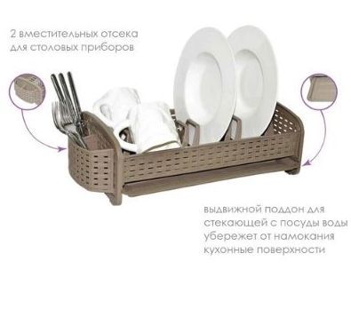 Изделие из пищевого пластика для сушки вымытой посуды. Имеет секции для размещения тарелок и столовых приборов. Съемный поддон соберет остатки воды, которая стекает с посуды. Текстура с имитацией натурального плетения «Ротанг» привнесет уют в ваш интерьер и придаст индивидуальность.