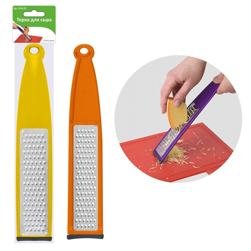 Удобная терка для сыра будет всегда у вас под рукой. Удобна в использовании, измельчает продукты различным срезом, не занимают много места и легко моется после использования. С помощью терки вы легко сможете измельчить сыр, овощи, фрукты и пр. продукты. Нет необходимости размещать доску, чтобы натереть продукты. Потрите их прямо над блюдом! С этой теркой сделать это очень просто, т.к. ее удобно держать в руке. Общая длина 29см. Изготовлено: коррозионностойкая (нержавеющая) сталь, пластмасса (ABS, TPR).