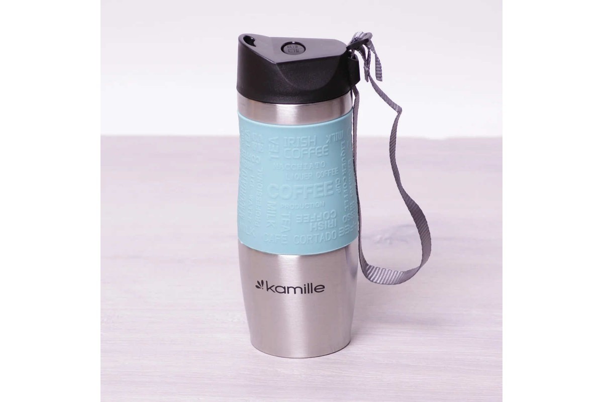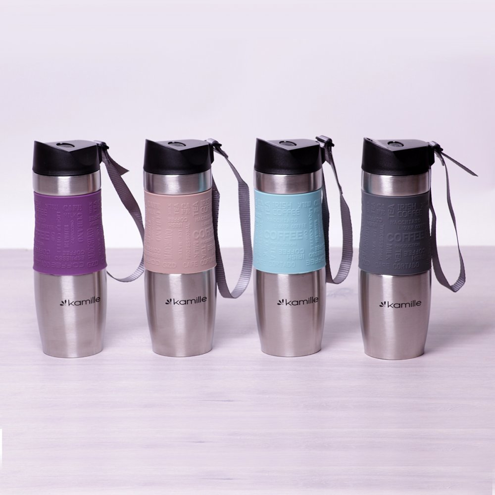 Тип термоса: питьевой. Материал корпуса: нержавеющая сталь, мягкая TPR-накладка. Материал колбы: нержавеющая сталь. Материал крышки: пластик. Объем: 480мл. Высота: 23.5см. Съемный клапан: нет (встроен в крышку). Ручка: нет. Поверхность: глянцевая. Время сохранения температуры: 6-8 часов. Дополнение: полиэстеровый ремешок с регулируемой длиной. Варианты цветов: бежевый, серый, голубой, фиолетовый. Упаковка: картонная коробка 8*8*24см.