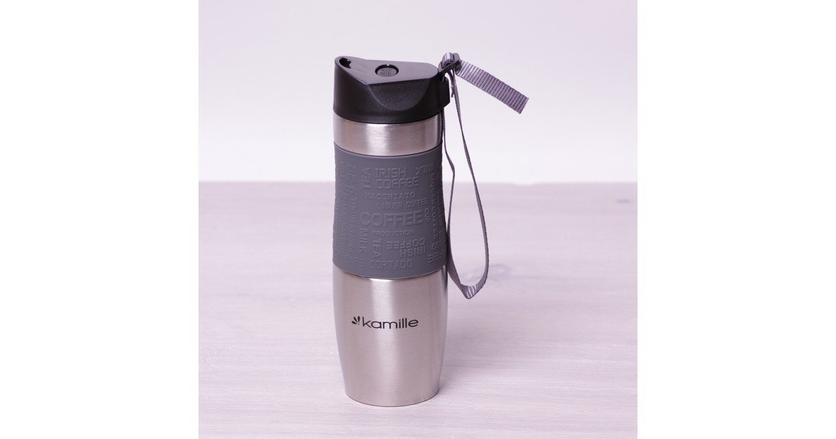 Тип термоса: питьевой. Материал корпуса: нержавеющая сталь, мягкая TPR-накладка. Материал колбы: нержавеющая сталь. Материал крышки: пластик. Объем: 480мл. Высота: 23.5см. Съемный клапан: нет (встроен в крышку). Ручка: нет. Поверхность: глянцевая. Время сохранения температуры: 6-8 часов. Дополнение: полиэстеровый ремешок с регулируемой длиной. Варианты цветов: бежевый, серый, голубой, фиолетовый. Упаковка: картонная коробка 8*8*24см.