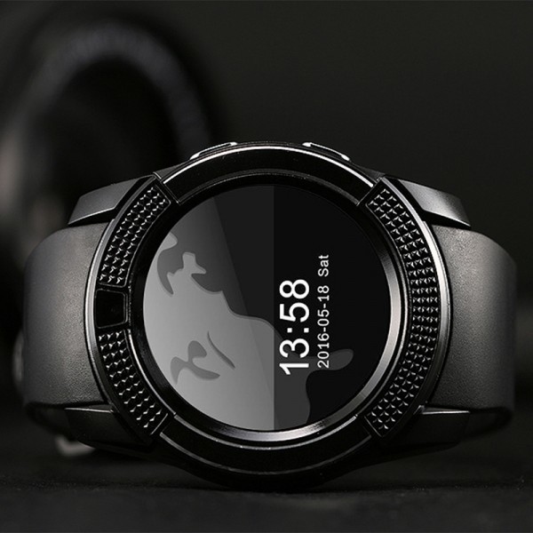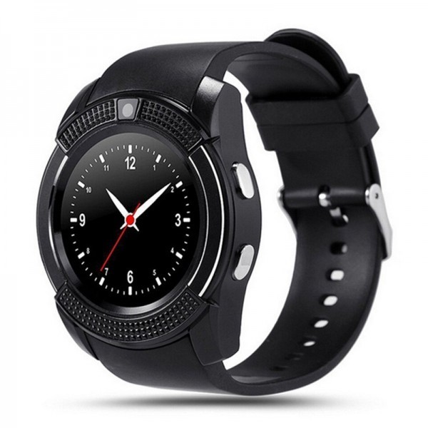 Умные часы Smart watch V8 представляют собой гаджет, который позволяет узнавать точное время, информацию о пройденном расстоянии, расходе калорий и фазе сна. Гаджет оснащен bluetooth модулем для синхронизации c вашим Android-смартфоном. Часы изготавливаются в круглом корпусе с классическим черным дизайном.Разъем под микро сим карту позволяет использовать часы в качестве телефона, а эргономичный ремешок из силикона надежно зафиксирует часы на вашей руке.