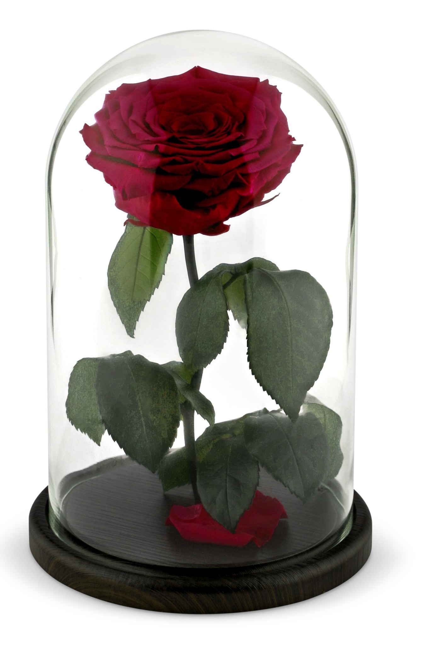 Стабилизированная роза выглядит так, будто мгновение назад росла в саду. Цветок не только на вид, но и тактильно совершенно ничем не отличается от свежесрезанного цветка. Роза под стеклом имеет приятный естественный аромат, который можно услышать, открыв прозрачный купол. Она не тускнеет и не выгорает.