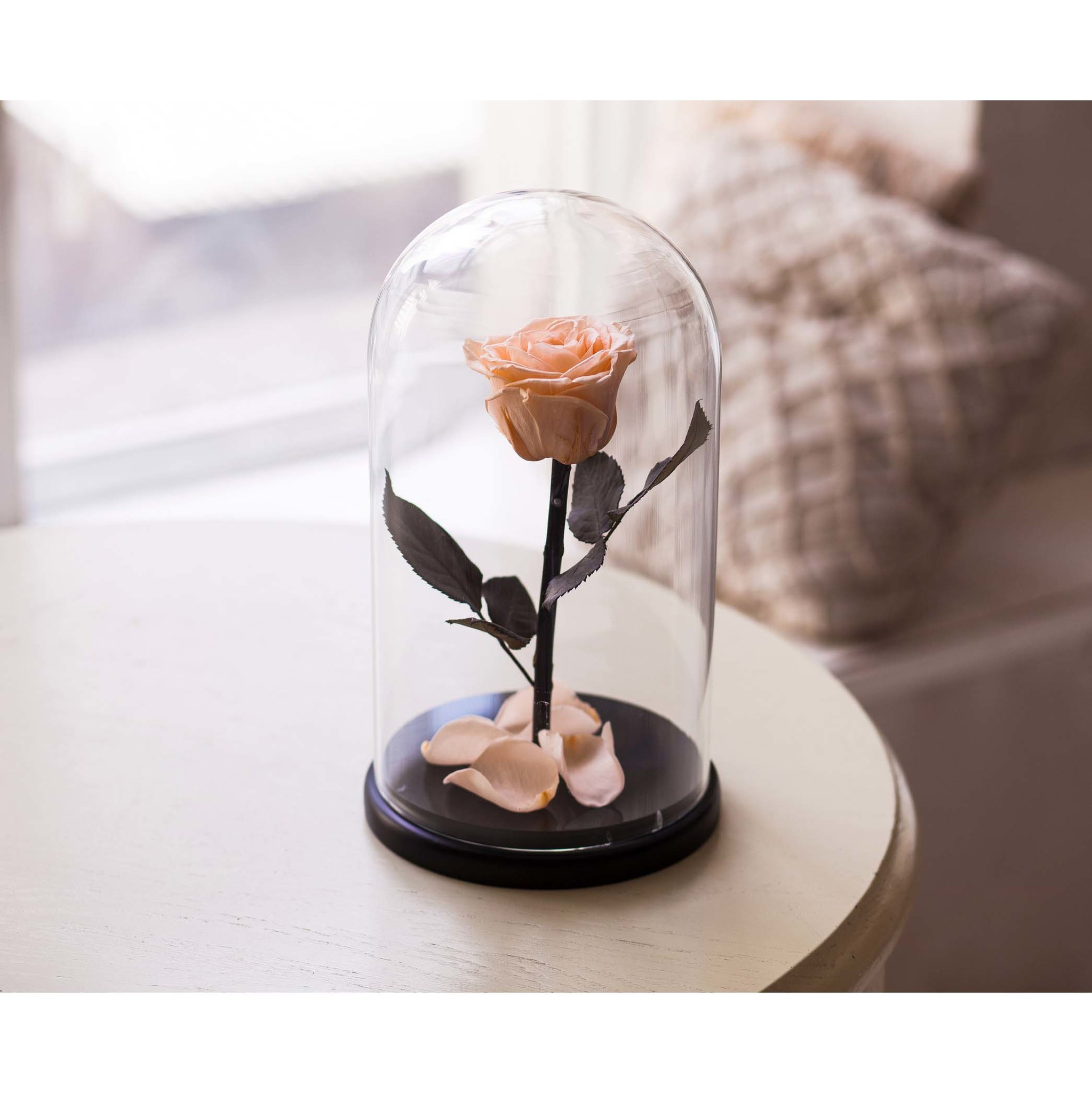 Стабилизированная роза выглядит так, будто мгновение назад росла в саду. Цветок не только на вид, но и тактильно совершенно ничем не отличается от свежесрезанного цветка. Роза под стеклом имеет приятный естественный аромат, который можно услышать, открыв прозрачный купол. Она не тускнеет и не выгорает.