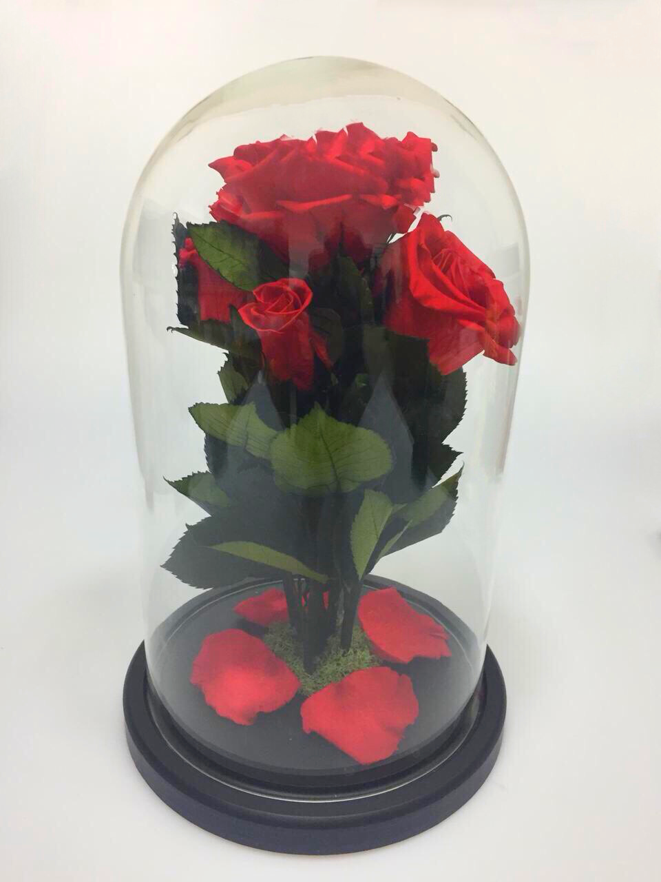 Стабилизированная роза выглядит так, будто мгновение назад росла в саду. Цветок не только на вид, но и тактильно совершенно ничем не отличается от свежесрезанного цветка. Роза под стеклом имеет приятный естественный аромат, который можно услышать, открыв прозрачный купол. Она не тускнеет и не выгорает.