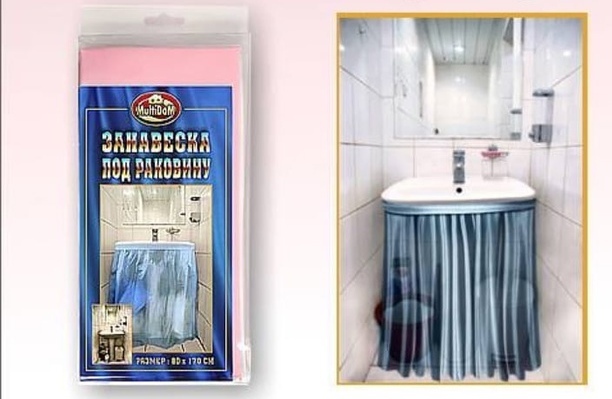 Зона под раковиной не всегда выглядит идеально и это пространство можно задекорировать. Занавеска под раковину поможет скрыть трубы, а также создаст дополнительное пространство для хранения всевозможных хозяйственных мелочей. Изделие изготовлено из виниловой пленки (полиэтиленвинилацетет), это гарантирует полную водонепроницаемость. Приспособление подходит как для ванной комнаты, так и для кухни, закрепляется на самоклеящуюся пленку. Чтобы прикрепить занавеску, обезжирьте поверхность и аккуратно приклейте верхний край на боковую поверхность.
